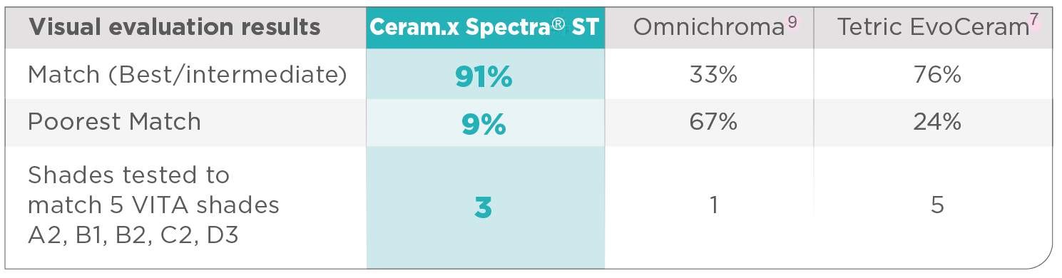 Il 91% delle valutazioni della tonalità dei compositi di Ceram.x Spectra® ST è stato valutato come corrispondente da 30 professionisti del settore odontoiatrico.8