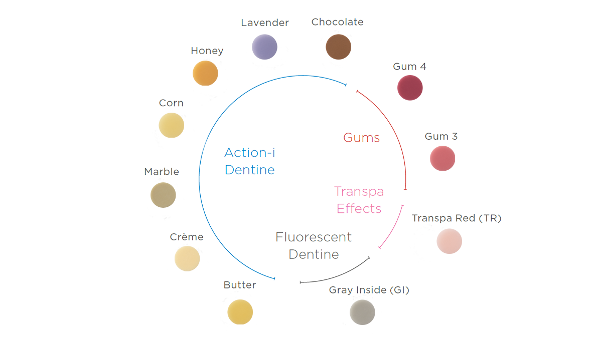 Con Action-i-Dentins, Dentsply Sirona introduce masse aggiuntive per una maggiore personalizzazione a supporto di concetti di rivestimento più avanzati con colori ricchi, tra cui le nuove tonalità Gum.