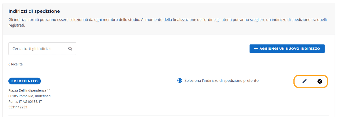 5. Scorri la pagina verso il basso fino a raggiungere la sezione Località di spedizione. Seleziona l’icona della matita da modificare, l’icona X da rimuovere o Aggiungi località per gestire gli indirizzi di spedizione del tuo studio