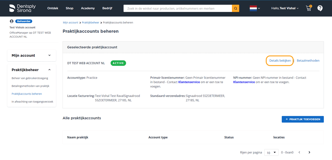 4. Selecteer de knop Details bekijken naast de praktijkaccount die u wilt aanpassen