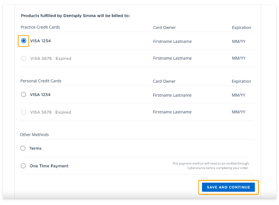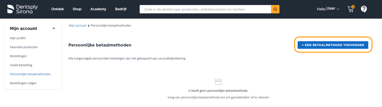 Uw persoonlijke betaalmethode kan worden gebruikt om aankopen te doen voor elke praktijk waaraan uw inloggegevens zijn gekoppeld. Volg deze aanwijzingen om een nieuwe creditcard aan uw betalingsopties toe te voegen: