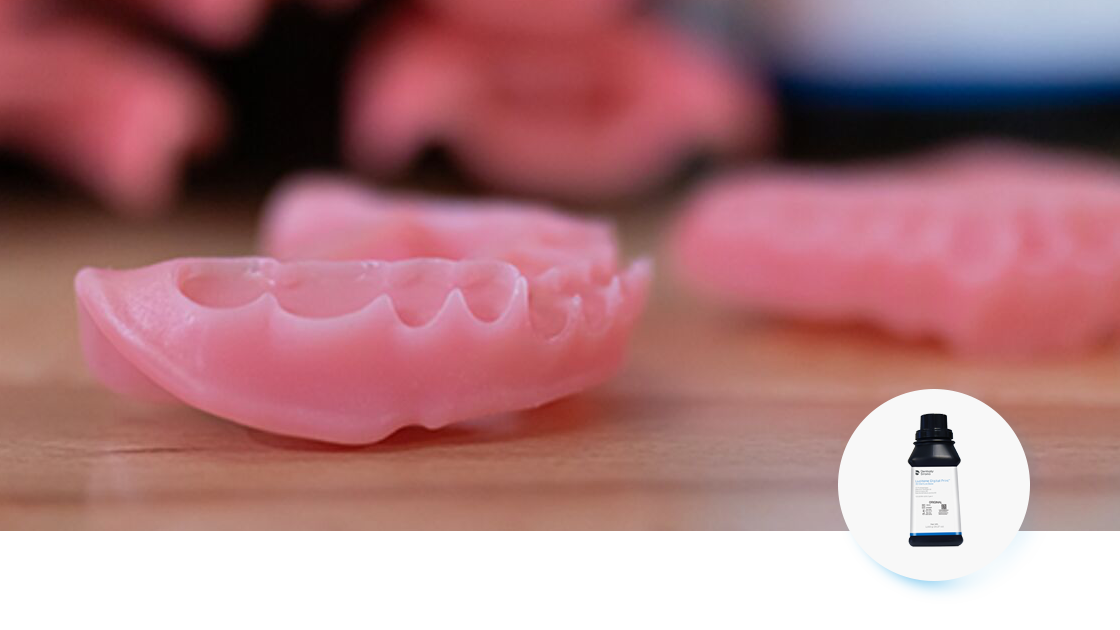 A nossa base para próteses 3D inclui todos as tons subtis, desde rosa claro a vermelho escuro, oferecendo um conjunto completo de tons de gengiva Lucitone para combinar com qualquer paciente.