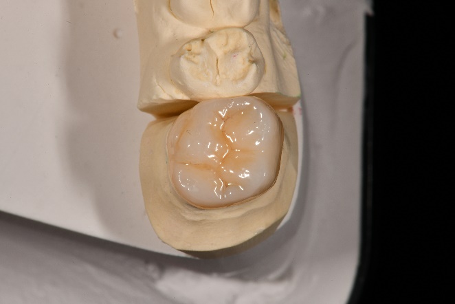 Lateral view of the finalized crown of tooth 16. Cervical part was individualized with stains.